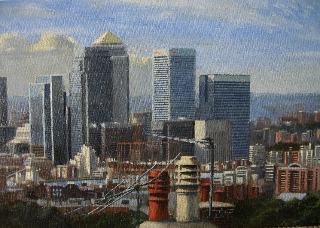|  Size: 107cm x 20cm, Medium: Oil on canvas laid on tulip wood panel, Price: £2,950 Panorama of Docklands and London looking North West from Shooters Hill (2012) | |