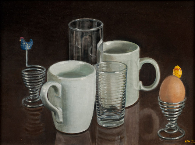 |  Size: 40cm/16 x 30cm/12, Medium: Oil on canvas, Price: £1,150 Two white china mugs, two plain drinking glasses and two eggcups with an egg (2009) - framed | |