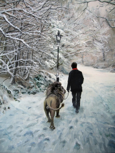 |  Size: 44cm x 56cm, Medium: Oil on linen, Price: NFS She has borrowed my red scarf and is taking the lion for a walk in the snow on Hampstead Heath (2013) | |