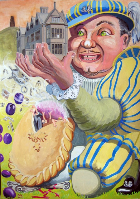 |  Size: 30cm x 45cm, Medium: Gouche on paper, Price: NFS Nursery rhyme of Jack Horner (allegedly) stealing the Mells estate from the Abbot of Glastonbury during the dissolution of the monasteries | |