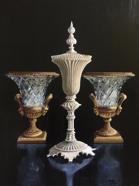 |  Size: 455mm x 610mm, Medium: Oil on lined, Price: POA Anglo-Indian ivory chalice flanked by two French cut glass and ormolu Campana urns | |