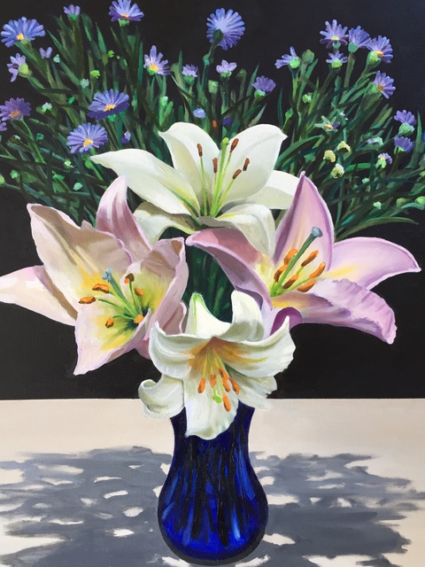 |  Size: 51cm x 61cm, Medium: Oil on canvas, Price: poa Three different lilies with daisy backdrop in blue glass vase | |