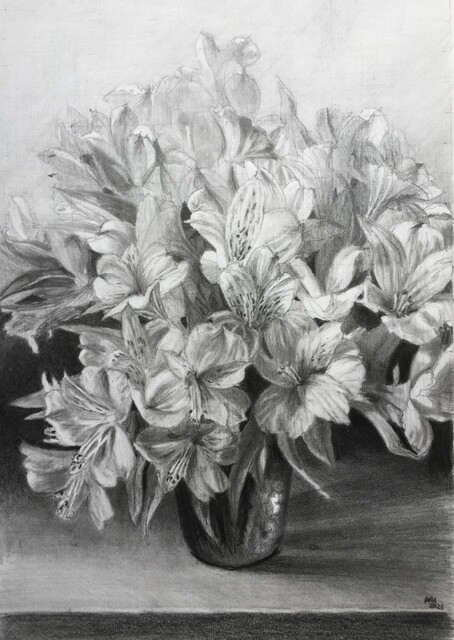 |  Size: 280mm x 420mm, Medium: Pencil and graphite on cartridge paper, Price: Bunches of alstroemerias in vase on a table with daylight from the side | |