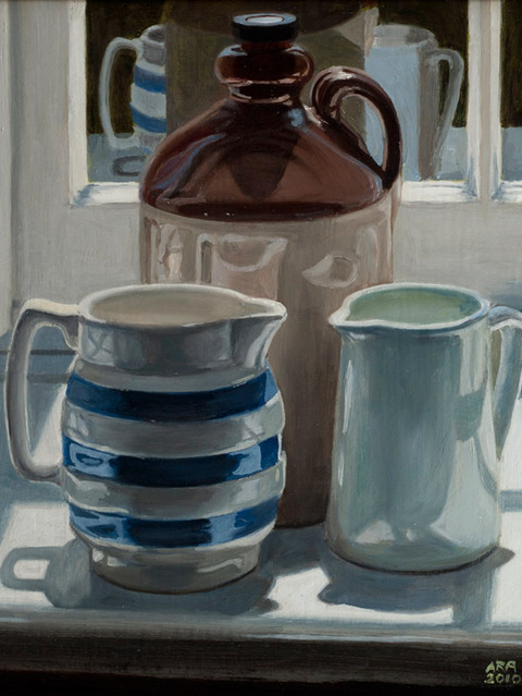 |  Size: 22cm/8 x 27cm/11, Medium: Oil on gesso/wood, Price: poa Cider jar, blue & white and white milk jugs (2010) - framed | |