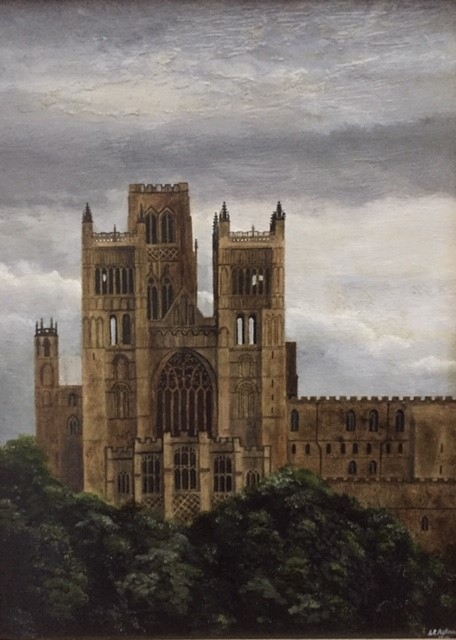 |  Size: 210mm x 300mm, Medium: Oil on panel, Price: NFS Durham Cathedral west front from Silver Street 1974 | |