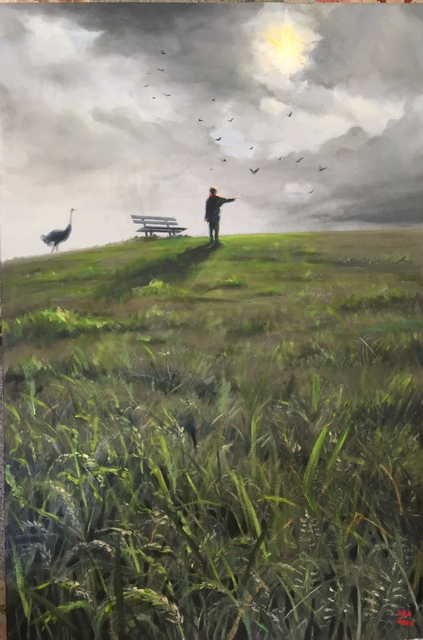 |  Size: 505mm x 760mm, Medium: Oil on canvas, Price: TBA She has taken my red scarf and is feeding birds on Hampstead Heath (2014) | |