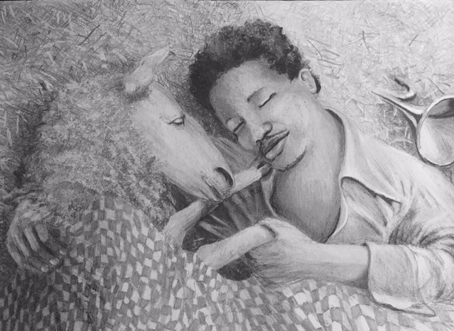 |  Size: 420mm x 300mm, Medium: Graphite and pencil, Price: Study Little Blue has got a bit too close to (one of) his flock and is now asleep, exhausted, under a haystack | |