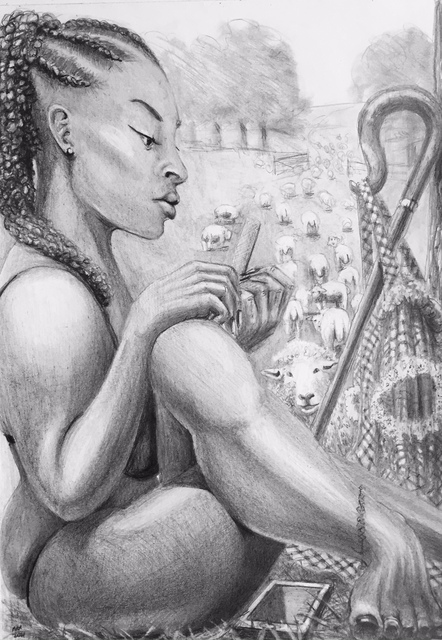 |  Size: 300mm x 420mm, Medium: Graphite and pencil, Price: Study Little Bo-Peep has no interest in shepherding and cast off her frumpy frock to get ready for the week-end | |