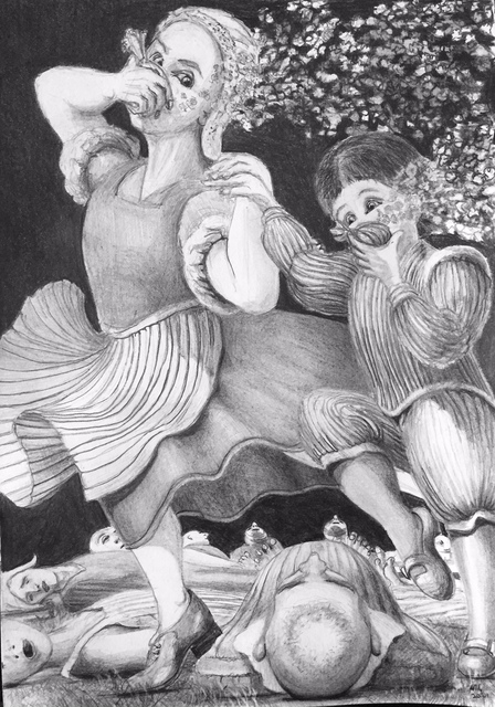 |  Size: 300mm x 420mm, Medium: Graphite and pencil, Price: Study Children dance over the corpses of plague victims, displaying the red ring of the virus, holding pomanders to mask the ensuing smell | |