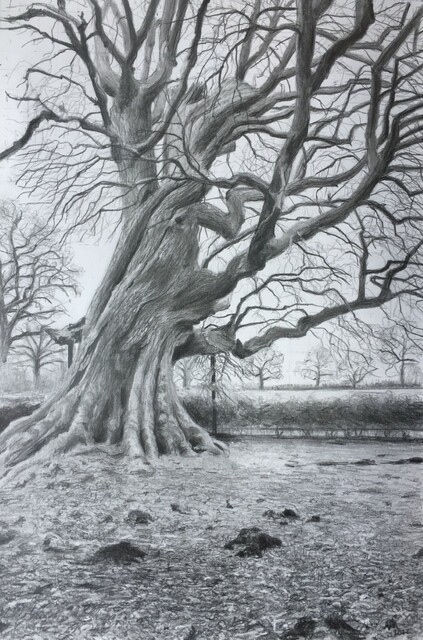 |  Size: 280mm x 420mm, Medium: Pencil and graphite, Price: poa Six hundred year old oak tree at Vyne House, Nr Basingstoke, Hants | |