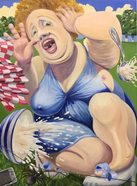 |  Size: 770mm x 1020mm, Medium: oil on canvas, Price: poa Little Miss Muffet is stuffing her face curds etc and is excessively frightened by a very small spider | |