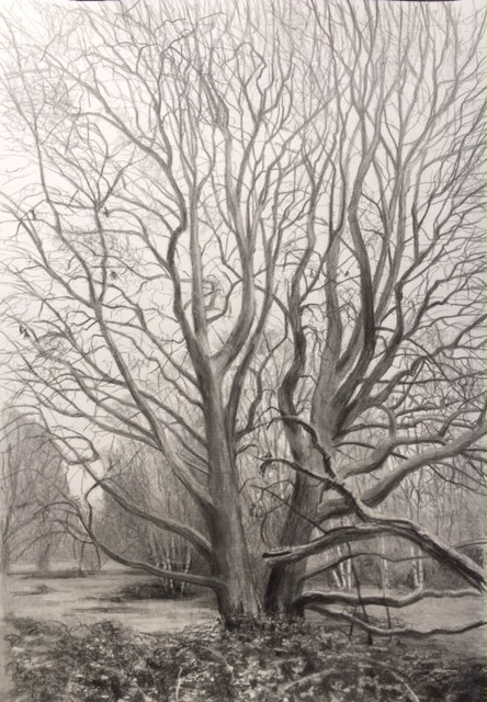 |  Size: 280mm x 420mm, Medium: Pencil and graphite on cartridge paper, Price: poa A pair of twin hornbeams with brambles on Hampstead | |