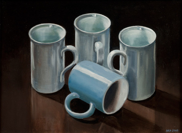 |  Size: 40cm/16 x 30cm/12, Medium: Oil on canvas, Price: £950 Three white pordelain mugs and one blue pottery mug (2009) - framed | |