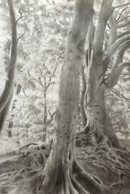 |  Size: 280mm x 420mm, Medium: Pencil and graphite on cartridge paper, Price: poa Beech trees on the inner rampart at Old Sarum fort on an August evening | |