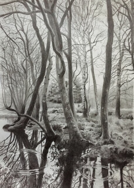 |  Size: 280mm x 420mm, Medium: Pencil and graphite on cartridge paper, Price: poa Birch trees after heavy rain in winter on road from Emery Down to Bolderwood | |