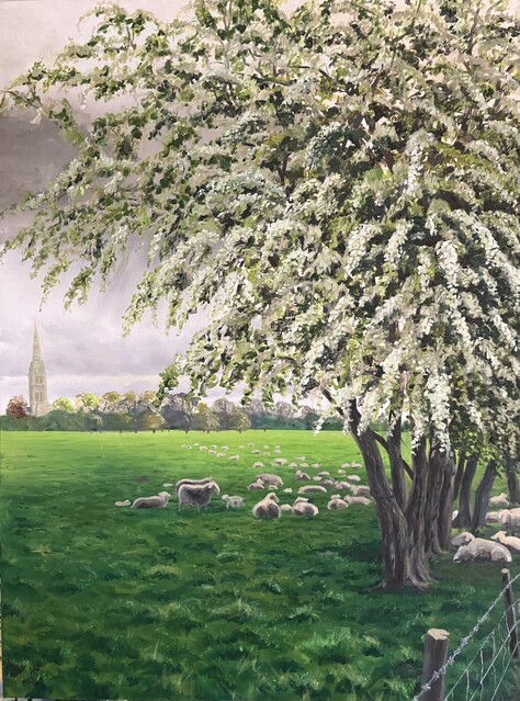 |  Size: 122mm x 910mm, Medium: Oil on canvas, Price: PoA Harnham meadows looking towards Salisbury cathedral from the\' town path\' in mid-Spring with mayflower and sheep | |