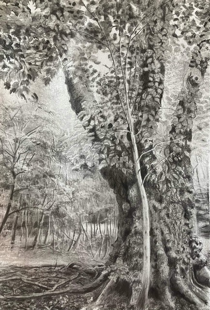 |  Size: 280mm x 410mm, Medium: Pencil and graphite on cartridge paper, Price: PoA Gnarled London plane tree upstaged by a young beech on Hampstead Heath | |