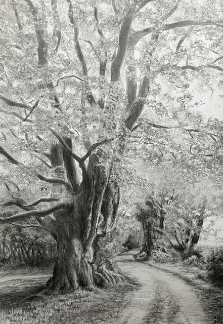 |  Size: 280mm x 420mm, Medium: Pencil and graphite on cartridge paper, Price: PoA Summer beech tree on track to \'the pond\' at Emery Down, New Forest | |