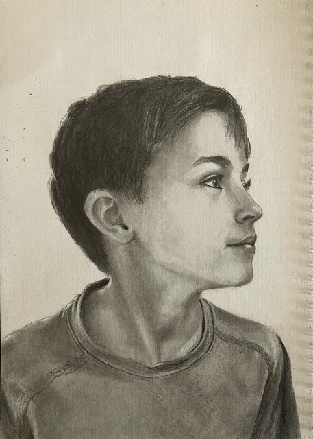 |  Size: 210mm x 330mm, Medium: Pencil on cartridge paper, Price: Commission CBD profile aged 9 | |