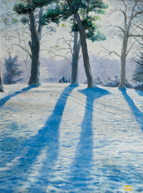|  Size: 30cm/12 x 40cm/16, Medium: Oil on gesso/wood panel, Price: £sold Vale of Health from Spaniards Road in snow (2010) - framed | |