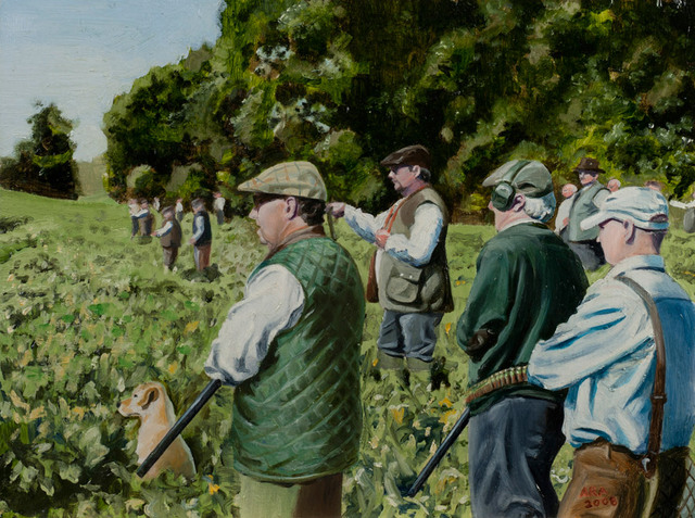 |  Size: 40cm/16 x 30cm/12, Medium: Oil on wood panel, Price: £525 Glemham Hall partridge shoot and dog training ('Guns': Messrs Hayter, Ewings and Welch) (2008) -unframed | |