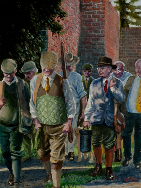 |  Size: 30cm/12 x 40cm/16, Medium: Oil on wood panel, Price: £sold Guns (Messrs, Bennett, Hayter, Welch, Ankers & Beales)leaving courtyard at Glemham for first partridge drive of the year (2008) unframed | |
