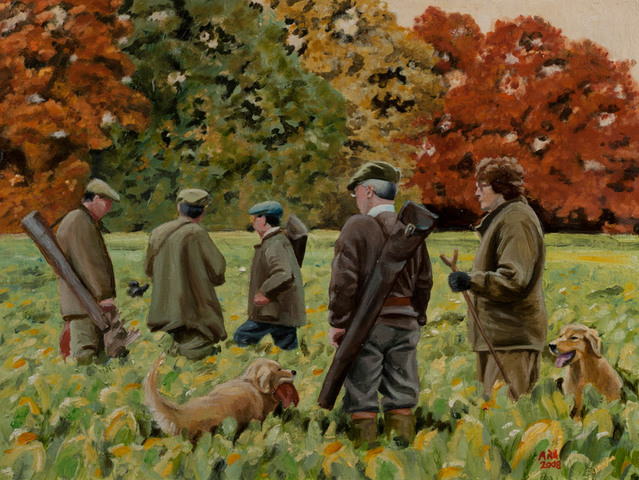 |  Size: 40mm/16 x 30cm/12, Medium: Oil on wood panel, Price: £495 Vauxhall & Raydon Wood shoot. Messrs Hayter, Maser, Edmonds, Welch and Di Ewings picking up at the end of the third drive in November (2008) - unframed | |
