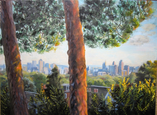 |  Size: 40cm/16ins x 30cm/12ins, Medium: Oil on board, Price: £poa Panorama of London (City and Canary Wharf) in evening sunlight from Spaniards Lane, Hampstead - 2010 | |